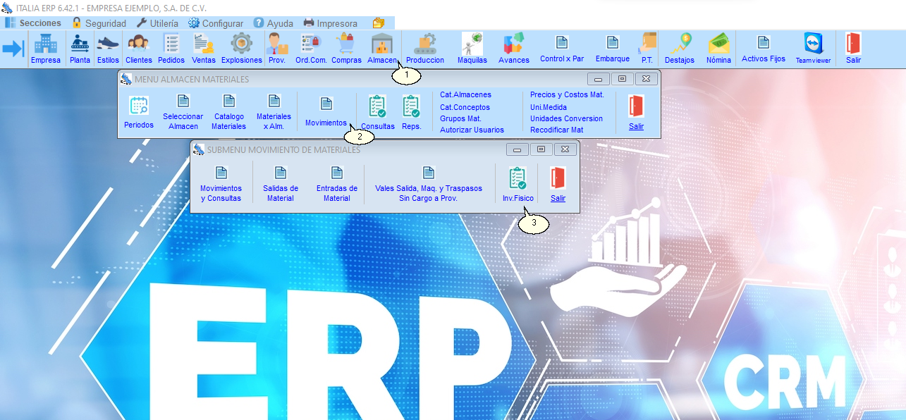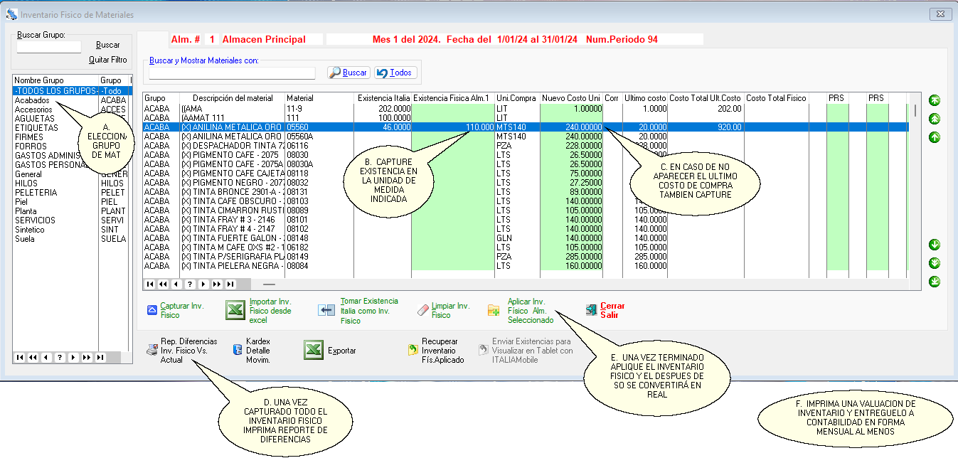 Menú Principal ITALIA© 🡺 Almacén de Materiales 🡺 Movimientos 🡺 Inventario Fisico.